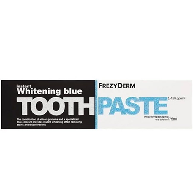 Pasta Frezyderm Whitening Blue jest przeznaczona do codziennego stosowania, umożliwiając natychmiastowe wybielanie i zapewniając piękny, jasny uśmiech. Dzięki unikalnej, innowacyjnej kombinacji specjalnego niebieskiego barwnika i granulek krzemu, pasta natychmiastowo sprawia, że zęby stają się wyraźnie bielsze, nie uszkadzając przy tym szkliwa.