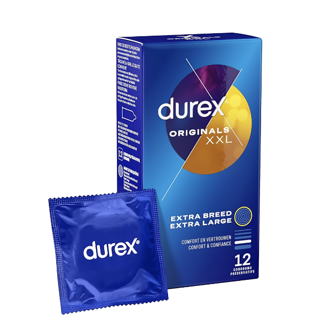 Durex Originals XXL to wyroby medyczne wykonane z naturalnej gumy lateksowej, przeznaczone do stosowania jako bariera ochronna. Charakteryzują się powiększonymi wymiarami dla zwiększonego komfortu. Każda sztuka posiada anatomiczny kształt z zakończeniem w formie zbiorniczka oraz jest pokryta środkiem nawilżającym na bazie silikonu. Produkt spełnia normy jakości ISO 4074, zapewniając wytrzymałość i szczelność. Opakowanie zawiera 12 sztuk.