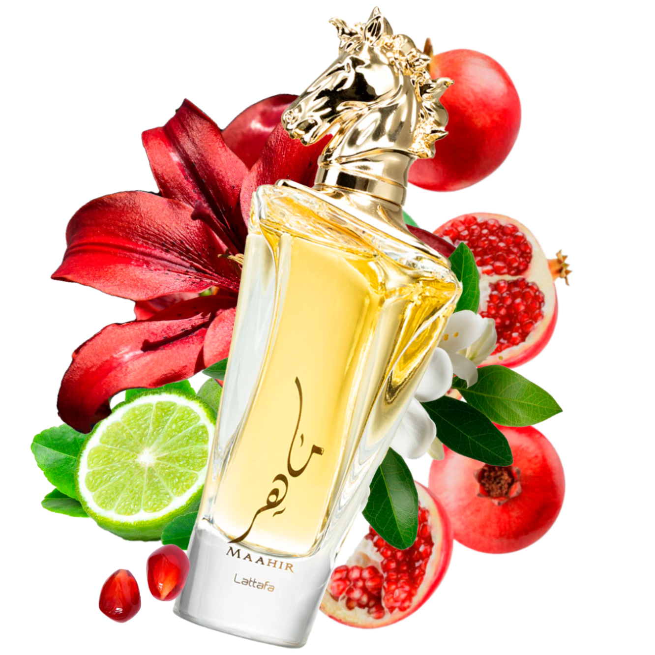 Lattafa Maahir Eau de Parfum Unisex to zmysłowa kompozycja, która harmonijnie łączy soczyste owoce z kwiatową elegancją i aksamitnym wykończeniem. W otwarciu dominują czerwone owoce, słodka brzoskwinia i świeża bergamotka. Serce zapachu przepełniają aksamitne nuty jaśminu, piwonii i czerwonej lilii.